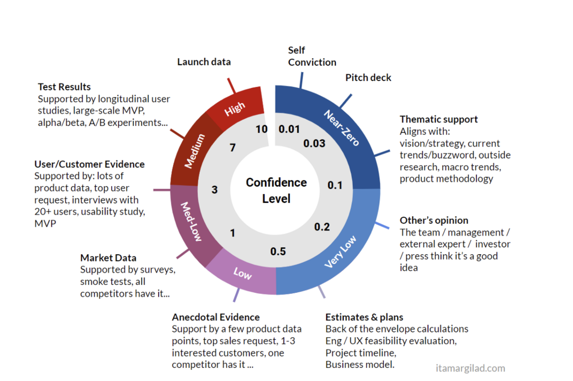 강한 가설은 ICE Confidence 가 높은 가설, 즉 근거가 충분한 가설을 의미한다. 근거가 쌓일수록 자신감 점수가 높아질 수 있는데, 작가는 이를 자신감 점수 (Confidence Meter)라는 개념으로 제안한다. 0점인 신념 (Self Conviction)에서 시작해서 10점인 배포 데이터 (Launch Data)까지 측정 가능하다.